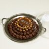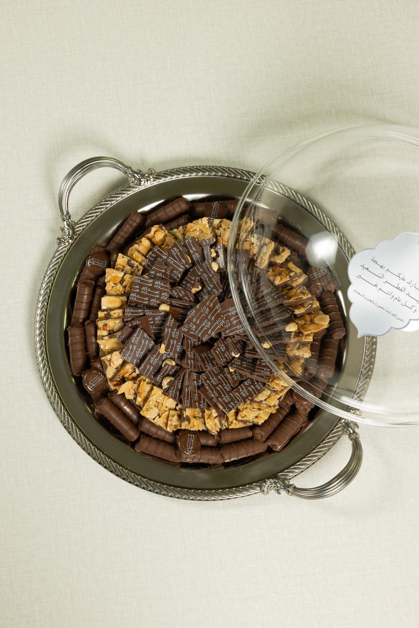 .صينية شوكولاتة أنيقة تضم ثلاث نكهات مختارة بعناية، مرتبة داخل صحن تقديم مع غطاء شفاف، لتكون خياراً مثالياً لضيافة العيد والهدايا الراقية