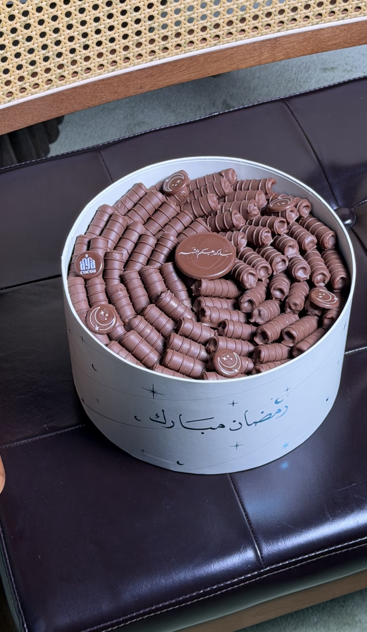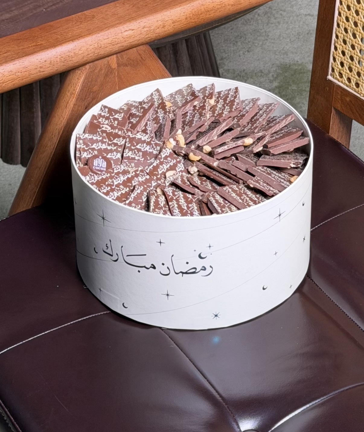 – علبة دائريه تحتوي على الواح ( بارز) من البندق المحمص بعبارة ” مبارك عليكم الشهر ” .