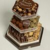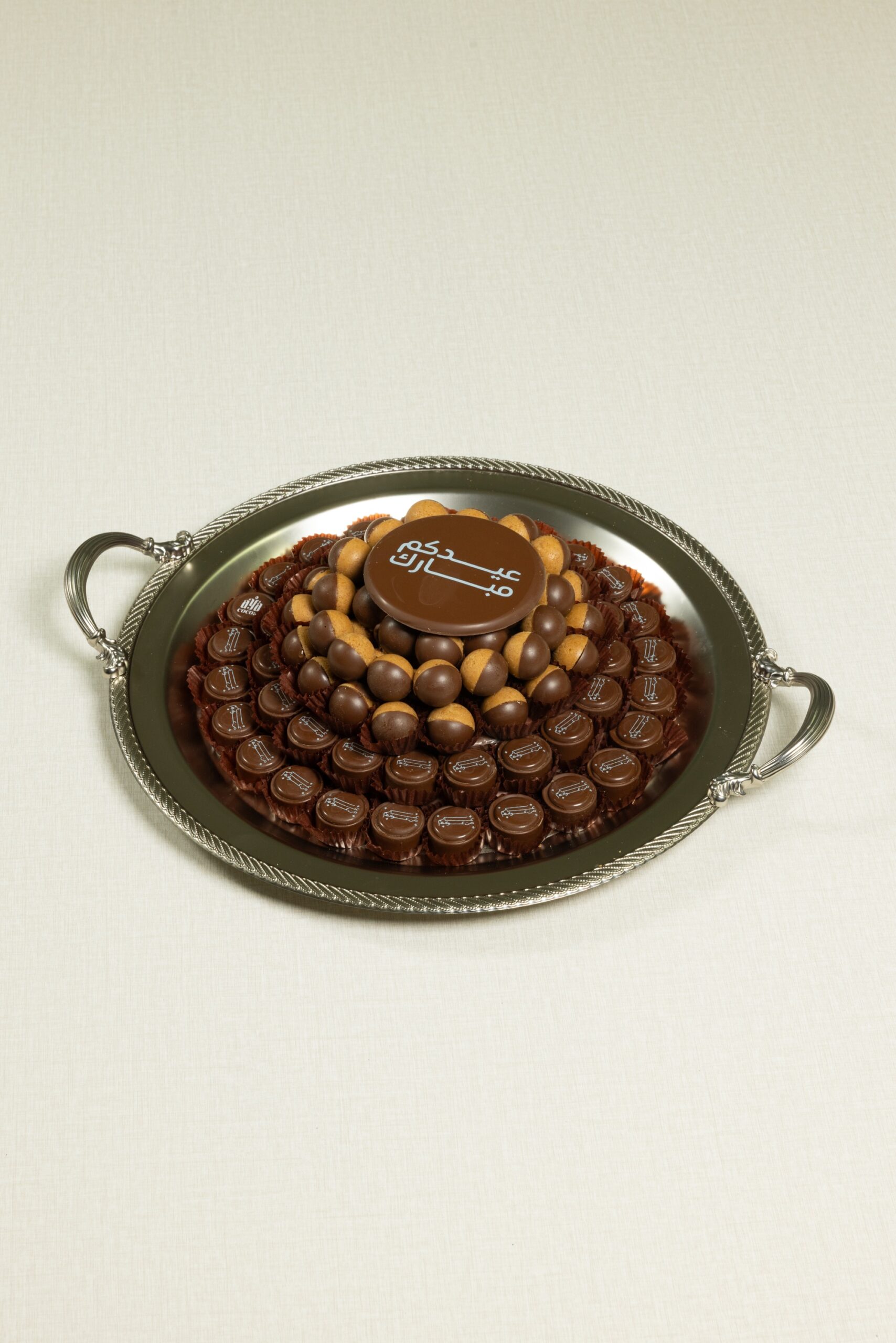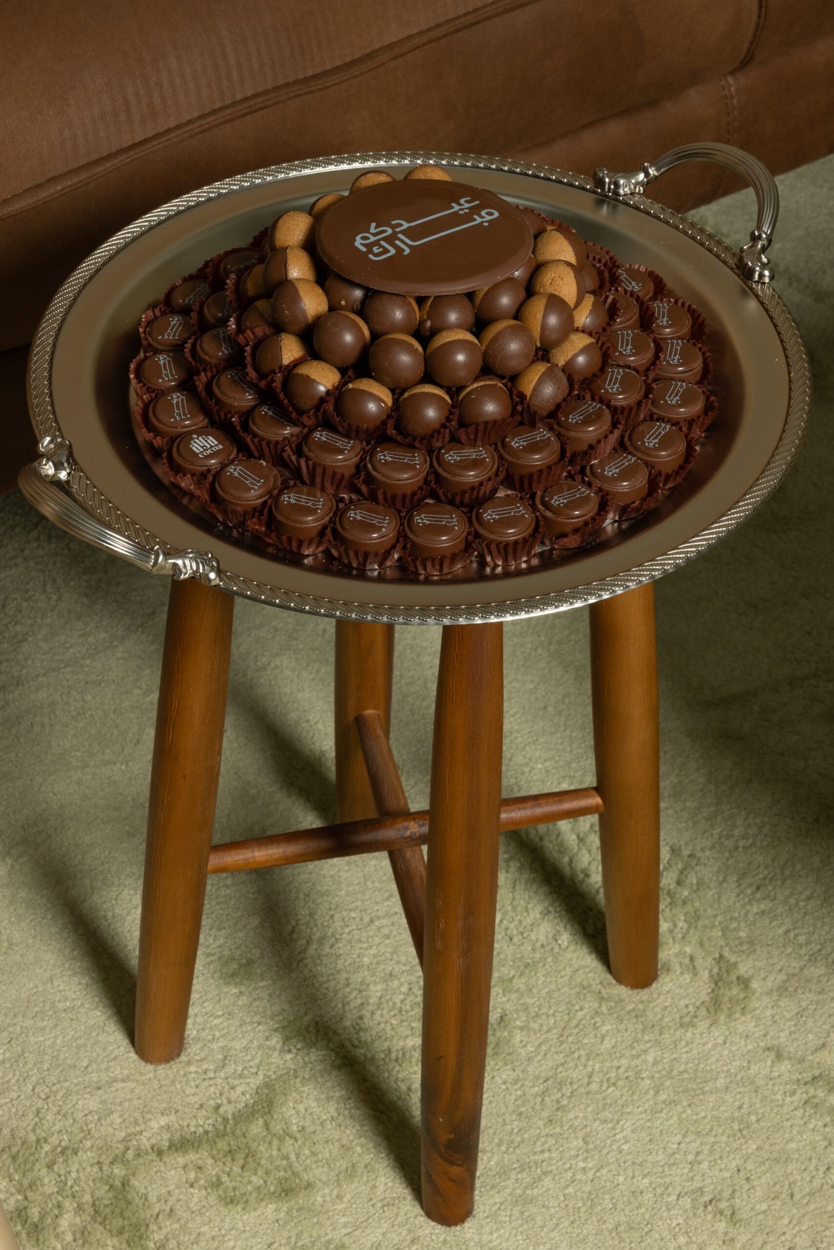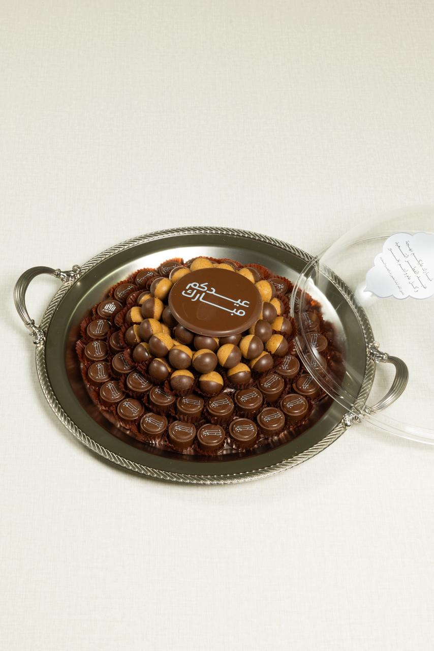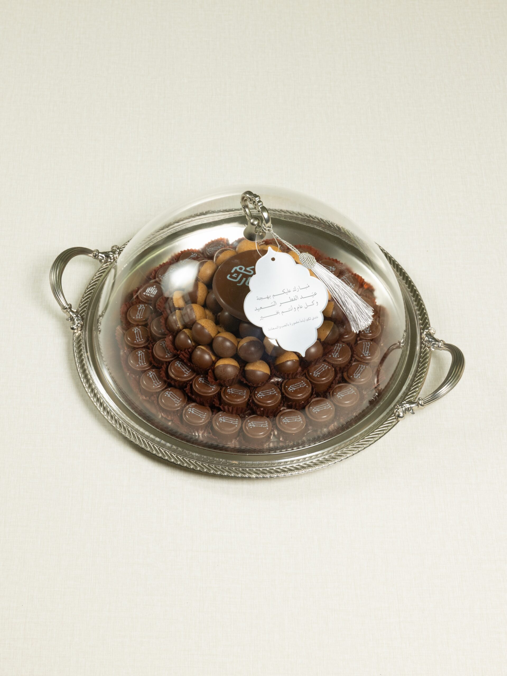 .صينية شوكولاتة أنيقة تضم تشكيلة مختارة من النكهات الغنية، مرتبة بعناية داخل صحن تقديم فاخر بغطاء شفاف، لتكون خياراً مثالياً لضيافة في العيد